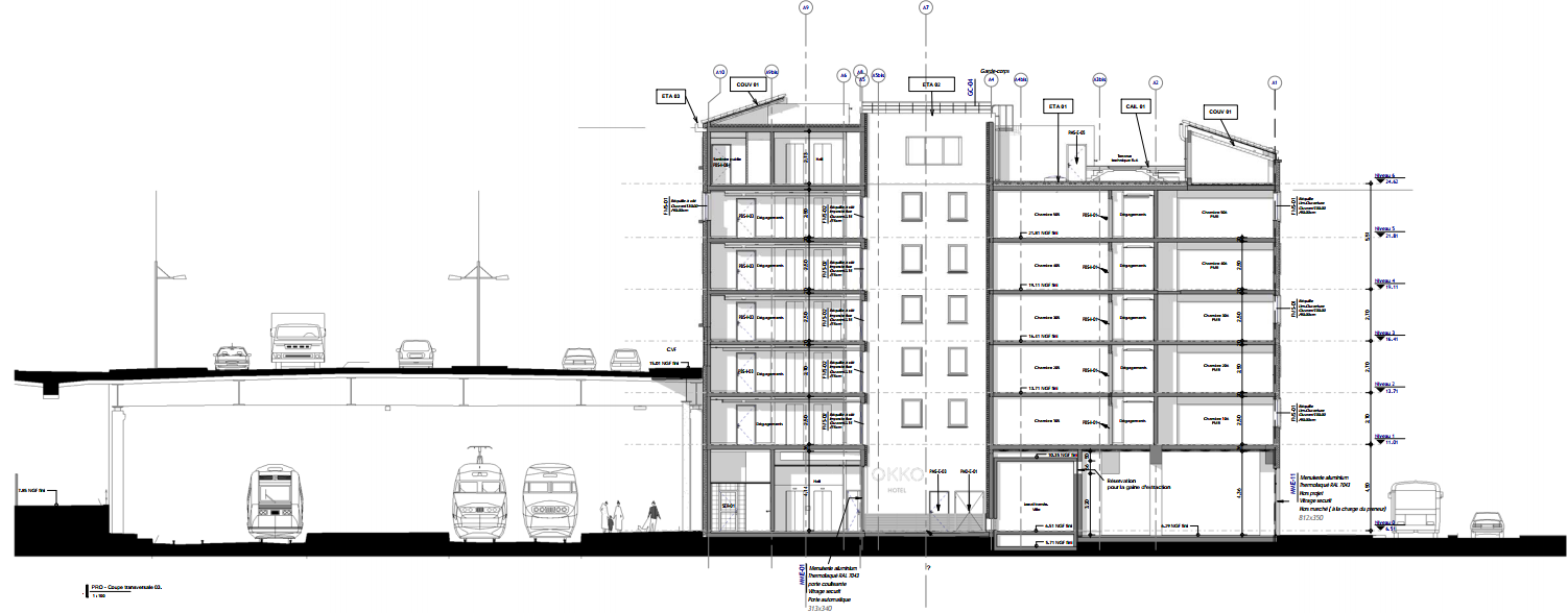 La façade sur l’escalier monumental de la gare est sobre, une partie est traitée d’éléments horizontaux et de baies sur les couloirs, au dernier niveau une grande baie tout hauteur marque l’espace de détente. Les chambres de l’ hôtel s’orientent essentiellement sur des vues Sud et Ouest.