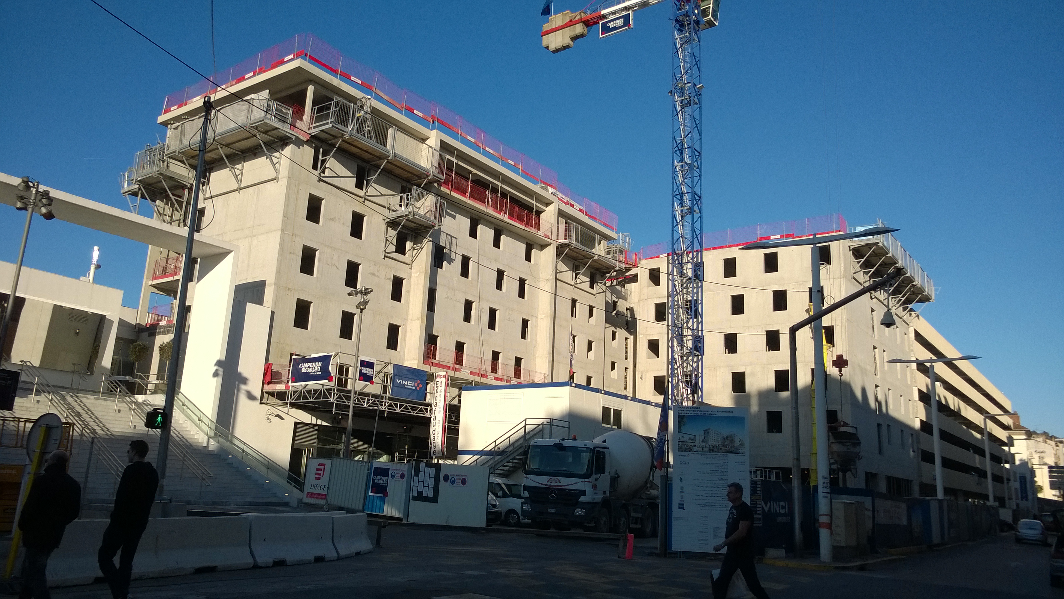 Le corps du bâtiment s’adosse à la gare SNCF de Cannes et se compose d’un volume émergent en forme de «L» avec un patio à l’angle intérieur. On distingue deux volumes dû à la faille produite par la présence de ce patio, espace de transition privé avant l’entrée dans le bâtiment. Une passerelle relie les deux volumes en partie haute pour que le «Club» jouisse d’une terrasse à l’air libre.