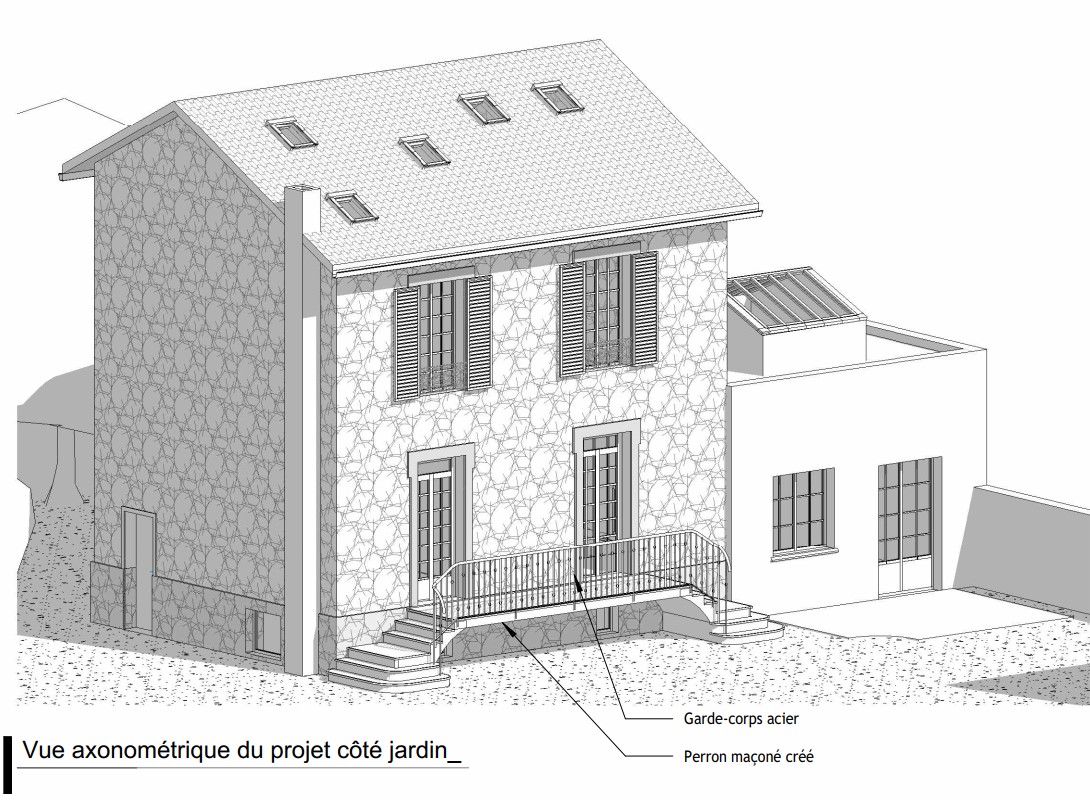 Des contraintes urbanistiques ont conduit l’architecte à proposer un ouvrage en forme d’un grand balcon équipé de double escalier. Sa largeur permettra d’y installer une petite table pour 2, et de prendre un café (ou un vin chaud…) sans quitter la cuisine, ou presque. Un garde-corps « à l’ancienne » en fer forgé y sera installé, il ne reste qu’à choisir la couleur.